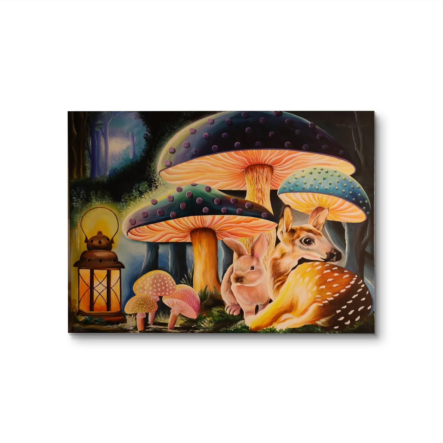 “Imagine a peaceful forest scene where a cute rabbit and a graceful deer find shelter under a giant mushroom. This acrylic painting bathes your eyes in soothing shades of blue, creating a calming atmosphere. Sized at 40″x30″ on canvas, it’s a charming addition to any space, bringing the tranquility of spring right into your home.”